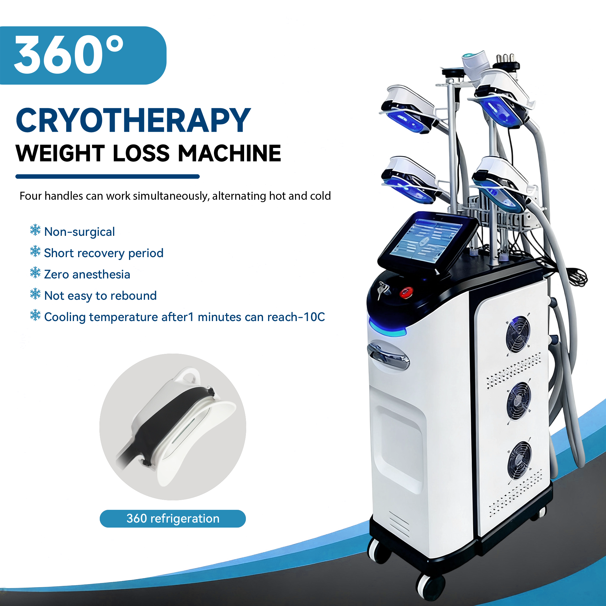 This is a vertical 360° cryotherapy weight loss machine, focusing on non-surgical local fat reduction and shaping. It is equipped with 4 cryo handles that can work simultaneously, supporting alternating hot and cold treatments, and is suitable for 360° all-around fat loss in areas like the waist, abdomen and thighs. With a touchscreen operation interface, it balances efficiency and comfort, featuring advantages such as short recovery period, zero anesthesia, and low rebound risk. It applies to medical aesthetic institutions and high-end body management centers, serving as a professional shaping device that combines fat loss efficiency and experience.