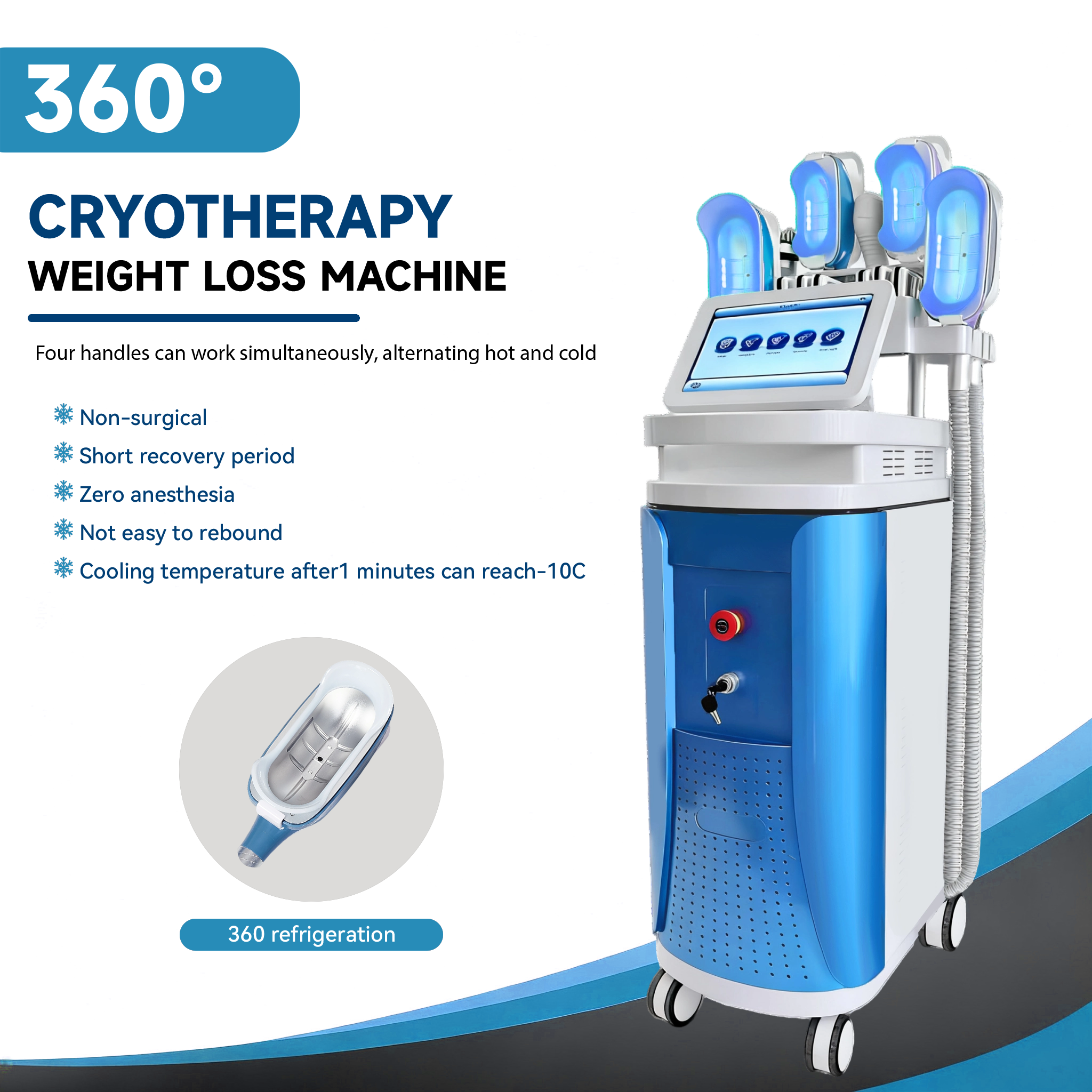 This is a vertical 360° cryotherapy weight loss machine, focusing on non-surgical local fat reduction and shaping. It is equipped with 4 cryo handles that can work simultaneously, supporting alternating hot and cold treatments, and is suitable for 360° all-around fat loss in areas like the waist, abdomen and thighs. With a touchscreen operation interface, it balances efficiency and comfort, featuring advantages such as short recovery period, zero anesthesia, and low rebound risk. It applies to medical aesthetic institutions and high-end body management centers, serving as a professional shaping device that combines fat loss efficiency and experience.