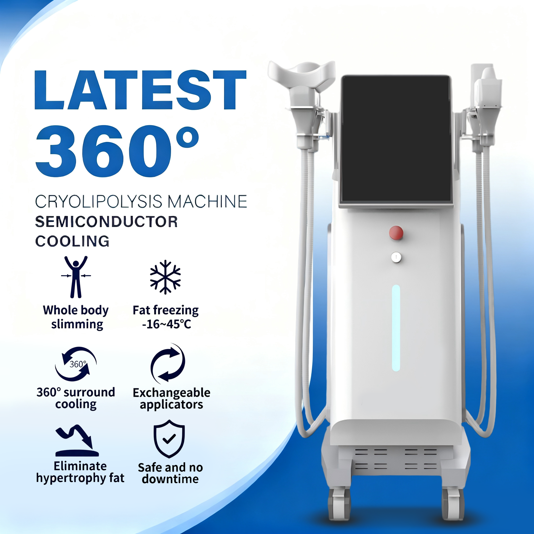 1. Multi-cartridge adaptation system: 7 specifications of cartridges (treatment area covers 110×50mm to 330×180mm), precisely matching fat areas of different parts; 2. 360° surround cooling technology: The cartridges are made of silicon material, which can fit the skin in 360° to ensure uniform cooling of fat tissue; 3. Wide-range temperature control system: The cooling temperature is adjustable from -16°C to 45°C, supporting precise temperature control to adapt to treatment needs of different fat thicknesses; 4. Vertical integrated design: The body has high functional integration and is equipped with mobile wheels, balancing operational stability and usage flexibility; 5. Safe non-damage design: It only acts on fat cells, causing no damage to normal tissues such as skin and blood vessels, and no downtime is needed after treatment.
