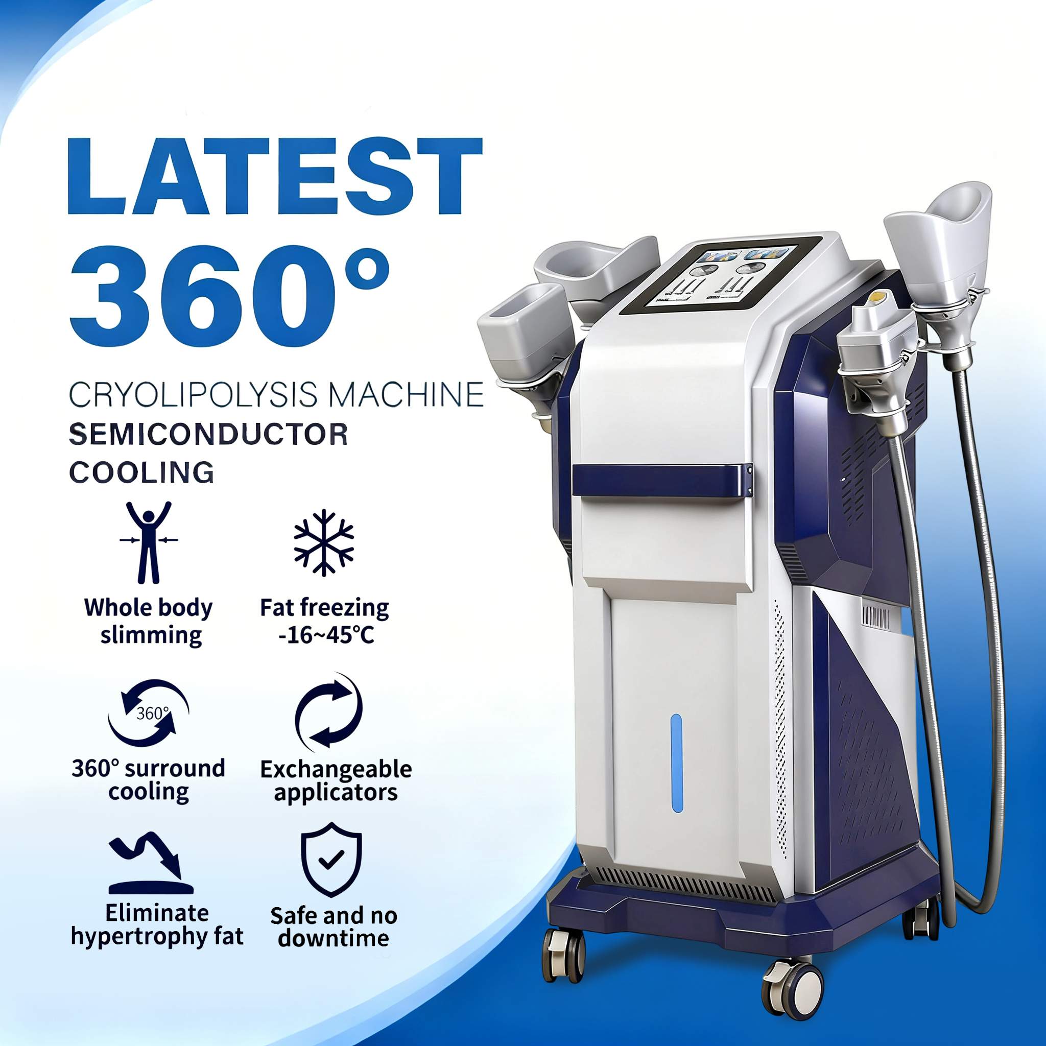 This is a vertical silicon fat freezing machine, equipped with 7 different specifications of treatment cartridges, supporting 360° surround cooling. It focuses on whole-body local fat reduction and shaping, and can precisely adapt to different areas such as the waist, abdomen, thighs and arms. With a cooling temperature range of -16°C to 45°C, it has the advantages of safety (no downtime) and eliminating hypertrophic fat. It applies to medical aesthetic institutions and high-end body management centers, serving as a professional non-invasive shaping device that balances multi-area adaptability and fat loss efficiency.