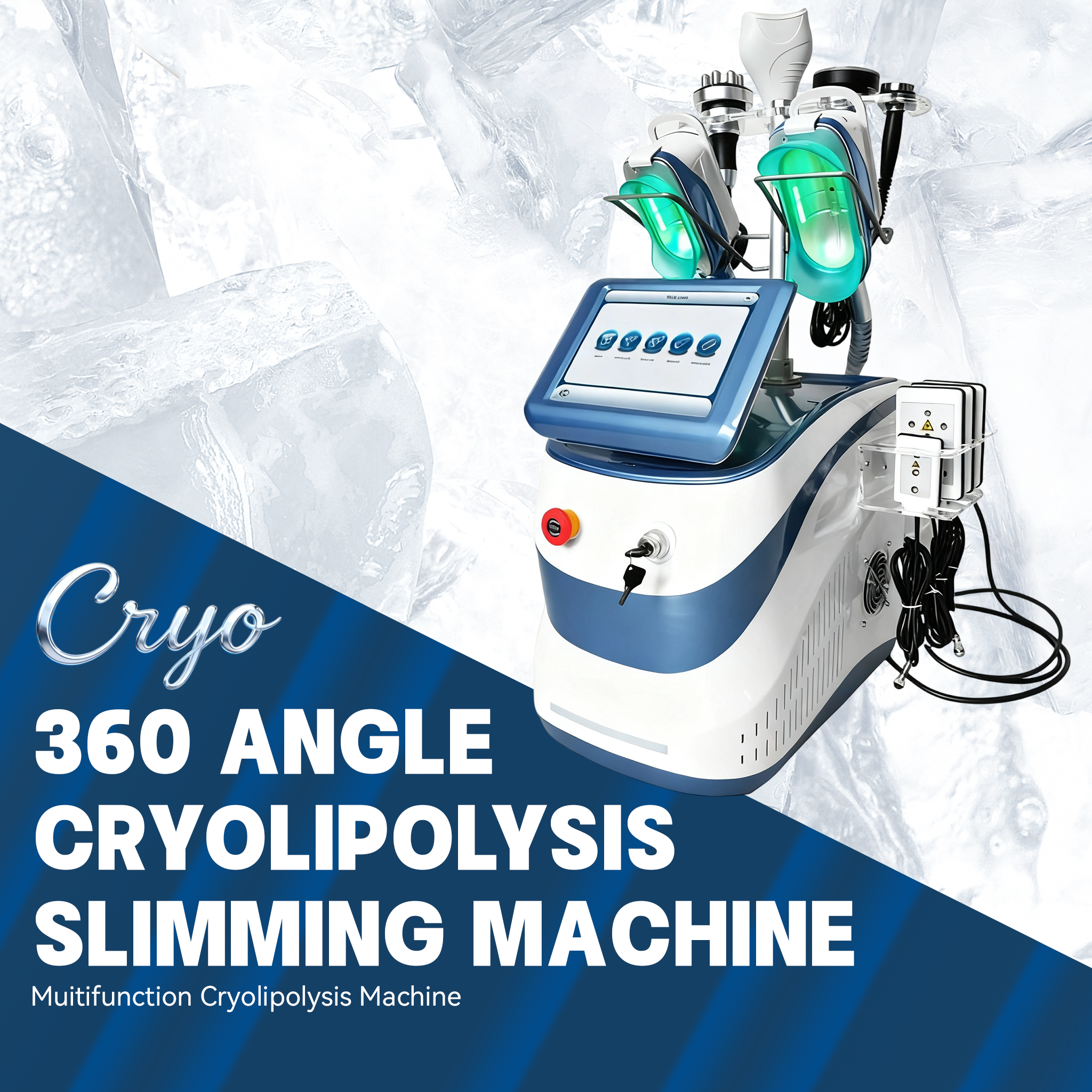 1. 360° all-angle cryo technology: The cryo handle can fit the skin in multiple dimensions, ensuring uniform cooling of fat tissue and avoiding local missed treatment; 2. Exchangeable multi-size handles: Adapt to different areas (e.g., large size for waist/abdomen, small size for arms) to improve treatment adaptability; 3. Intelligent temperature control system: The touchscreen precisely adjusts the cryo temperature (-10℃ to 5℃), monitors skin temperature in real time to avoid frostbite risk; 4. Portable integrated design: Compact body with integrated functions, suitable for movement in treatment rooms or on-site service scenarios.