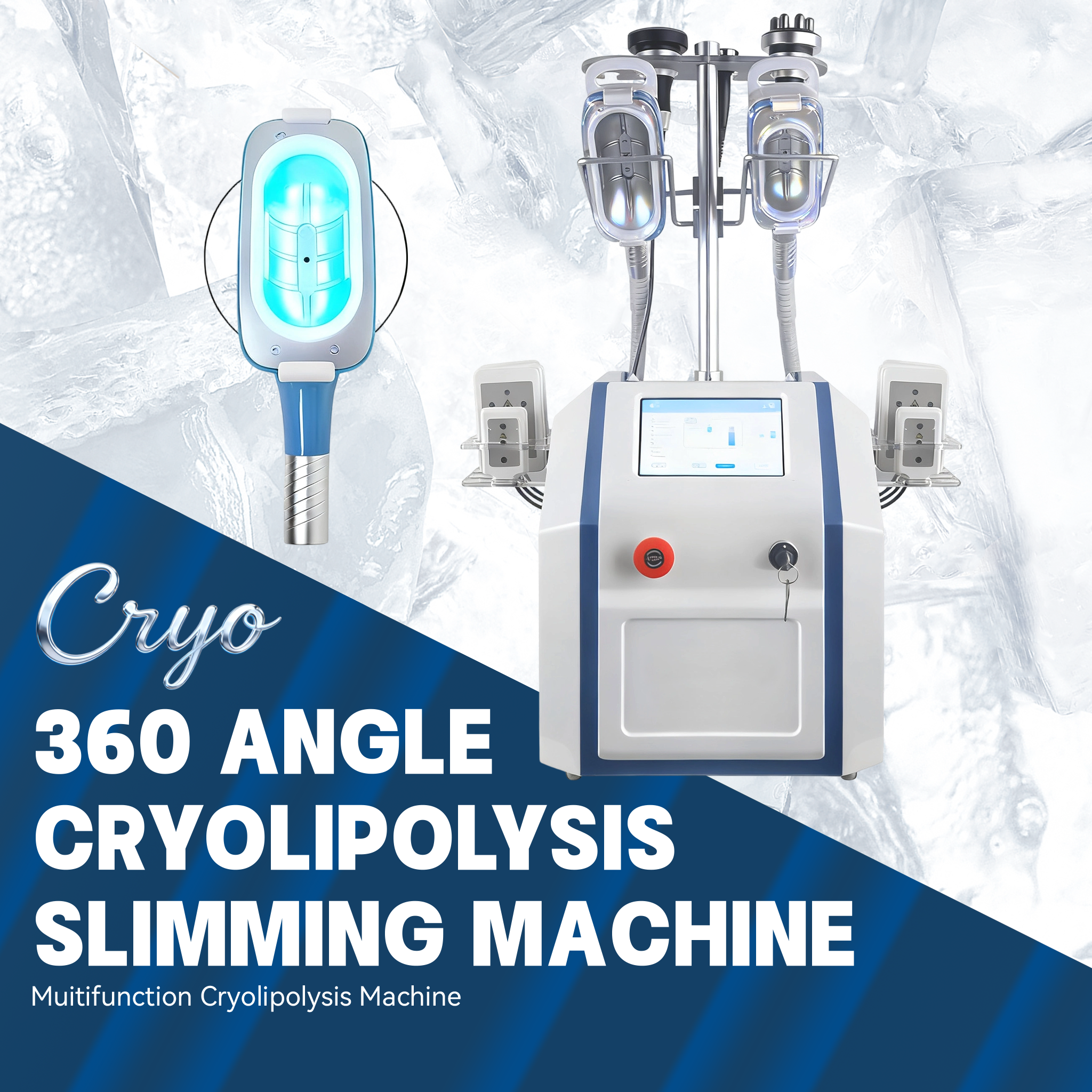 This is a portable 360° cryolipolysis slimming machine, focusing on local fat freezing decomposition and body shaping. It is equipped with exchangeable cryo handles of different sizes, suitable for 360° all-around treatment of areas like the waist, abdomen and thighs. The device integrates a touchscreen operation interface, balancing portability and multifunctionality. It applies to small and medium-sized medical aesthetic institutions and body management centers, serving as a non-invasive fat reduction device that combines comfortable experience and shaping efficiency.