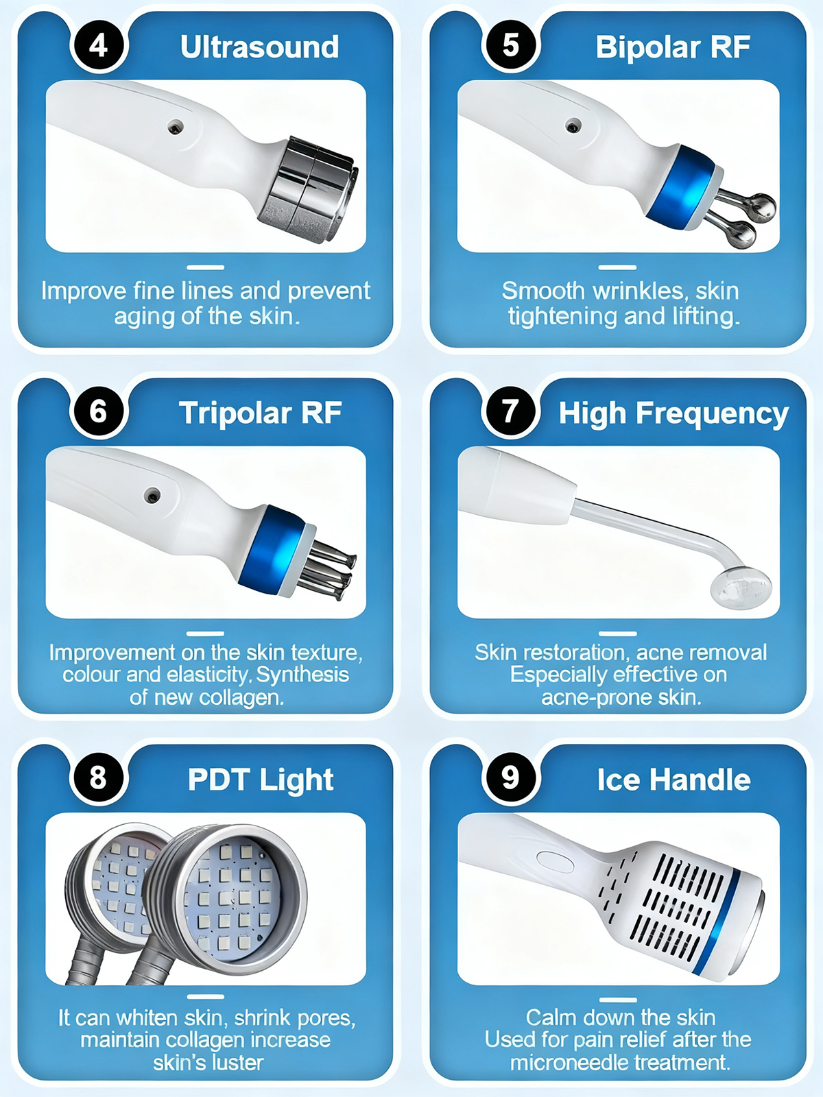 Phototherapy Technology: Dual PDT (Photodynamic Therapy) heads use multi-wavelength light waves to achieve skin brightening, acne removal, and skin rejuvenation.