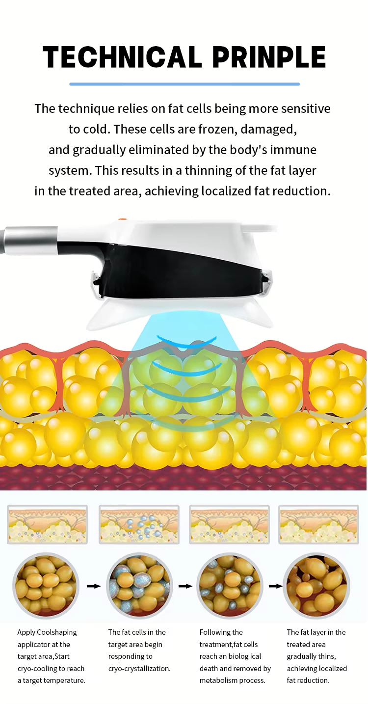 Based on the biological characteristic that "fat cells are more sensitive to low temperatures", the device accurately controls the temperature of the treatment area at around 4°C, causing natural apoptosis of fat cells. However, tissues such as skin and muscles are not damaged due to their high tolerance. The apoptotic fat cells are gradually metabolized and excreted through the human lymphatic system, ultimately reducing the thickness of the fat layer with long-lasting effects (it is not easy to rebound under healthy eating and exercise habits).