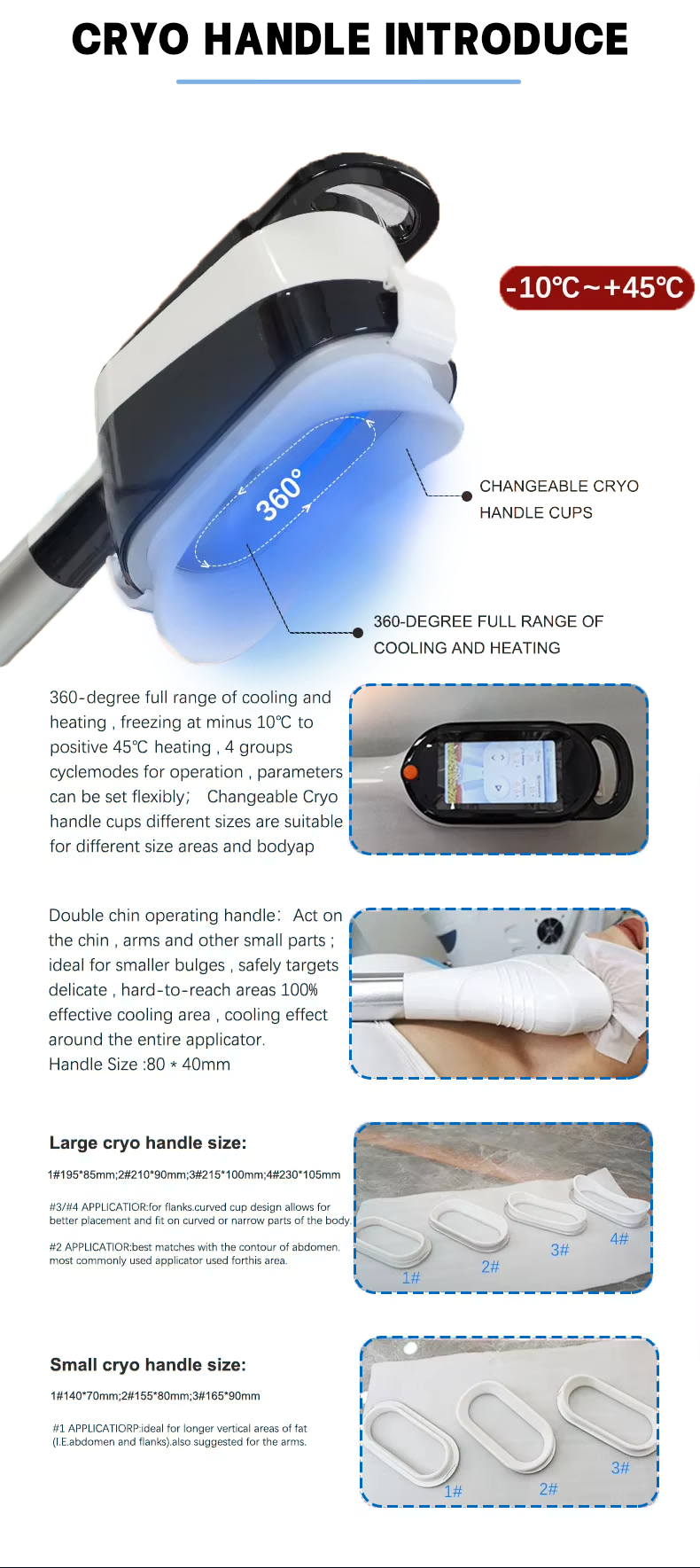 By applying low temperature to fat cells, the fat cells undergo apoptosis, and then these apoptotic fat cells are naturally metabolized and excreted by the human body. It adopts a non-surgical method, with four handles that can work simultaneously, alternating between cold and heat. The temperature can reach -10°C within 1 minute after cooling, which can targetedly reduce local fat. It also features a short recovery period, no need for anesthesia, and low tendency to rebound.