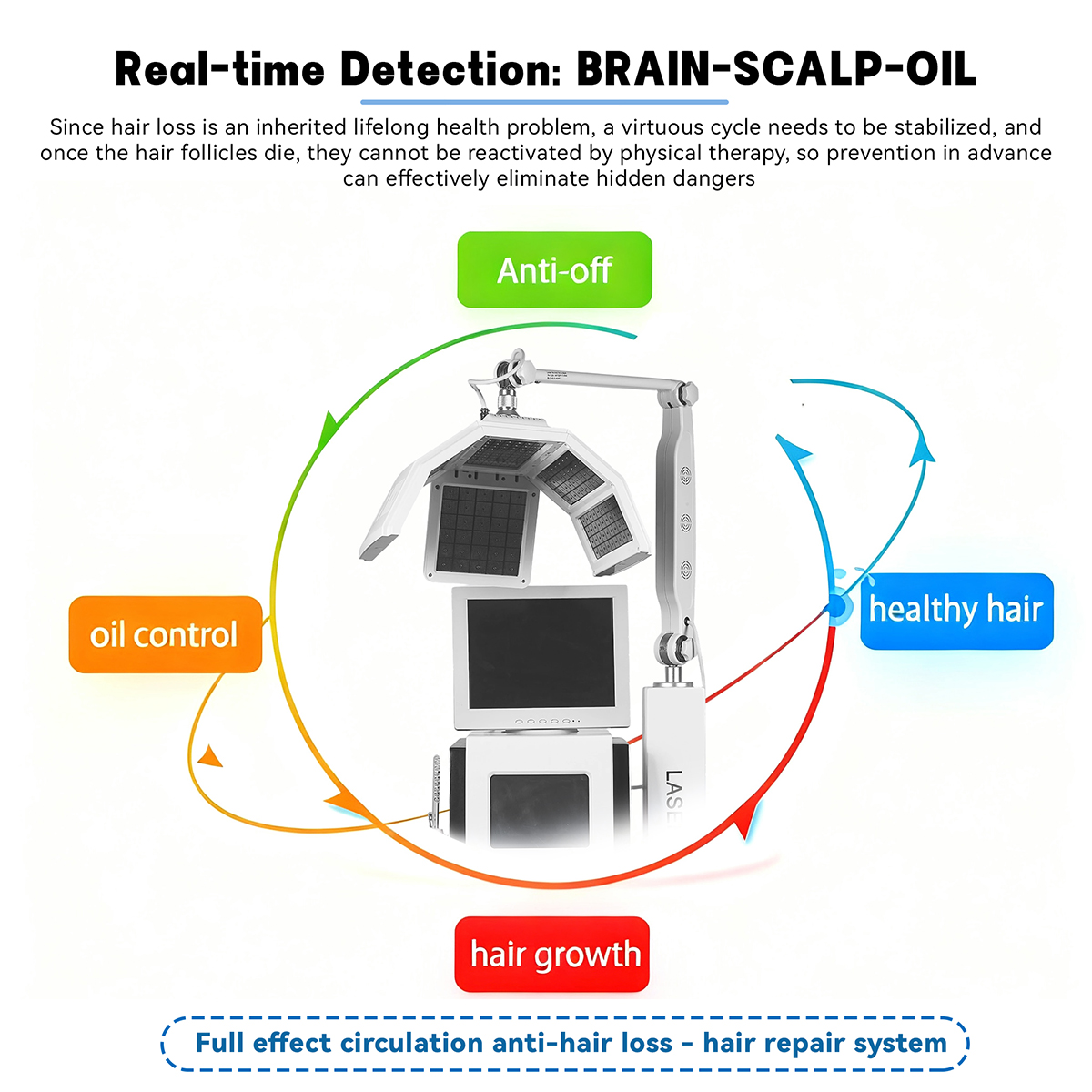 Low-energy soft laser stimulates hair follicles to activate their vitality, thereby promoting hair growth and reducing hair loss. At the same time, it combines multiple functions such as oxygen injection, meridian brush massage, high-definition detection, and high-frequency care to provide all-round scalp maintenance. Additionally, it can achieve body care effects such as fat reduction and skin anti-aging.