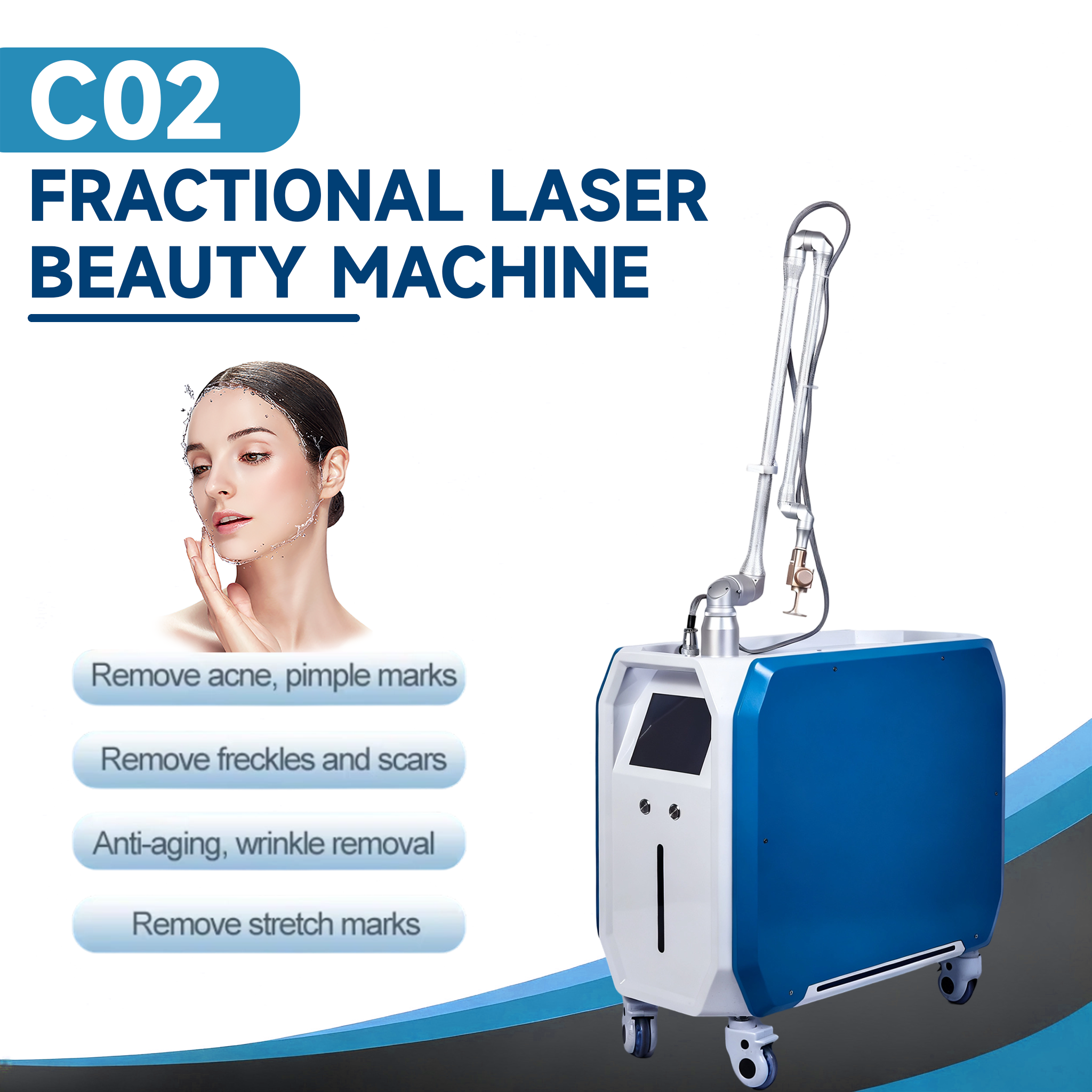 Skin care principle: Based on the "micro-damage repair mechanism" of fractional CO₂ laser, the laser acts on the skin in a fractional pattern, forming controlled micro-damage areas in the epidermis and dermis. The undamaged tissue serves as a repair source, stimulating fibroblast proliferation and the regeneration & reorganization of collagen and elastic fibers, thus achieving scar lightening, anti-aging and skin texture improvement;