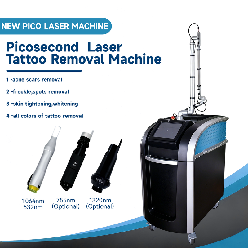 1. Three-wavelength Q Switch picosecond technology: 1064nm for dark tattoos such as black/blue and deep pigments, 532nm for light-colored tattoos such as red/orange, 755nm for difficult-to-remove colors such as green/purple, with pulse width ≤500ps and Q Switch trigger speed <10ns, shattering pigments into nano-scale fragments and reducing the risk of scarring; 2. Intelligent pigment recognition system: Built-in high-definition image acquisition module, automatically analyzes tattoo pigment composition and distribution, matches optimal wavelength and energy parameters, and improves treatment efficiency by 40%; 3. Precise energy regulation: 15-inch touch screen supports stepless adjustment of energy density (1-20J/cm²) and frequency (1-20Hz), stores 50 sets of personalized treatment programs, and supports multi-physician authority management; 4. Four-fold cooling protection: Integrating air cooling + water cooling + semiconductor + sapphire contact refrigeration, the treatment head temperature is stably maintained at 3-8℃, and the epidermal thermal damage rate is reduced to below 0.1%; 5. Professional durable configuration: The laser source has a service life of 300,000 shots, the treatment head adopts scratch-resistant quartz window, and the device has a real-time monitoring function of pigment removal rate, suitable for high-frequency diagnosis and treatment scenarios.