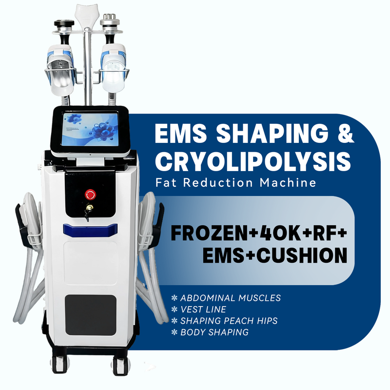 1. Multi-technology synergy system: Integrates cryolipolysis (fat reduction), EMS (muscle building), 40K cavitation (fat cell disruption), RF (skin tightening) and other functions, achieving one-stop effects of "fat loss + shaping + firming"; 2. 360° omnidirectional cooling: The cryo probe can fit the skin in 360° to ensure uniform cooling of fat tissue; 3. Precise EMS stimulation: Electromagnetic pulses act precisely on the muscle layer, inducing muscle contraction to improve muscle mass and definition; 4. Vertical multifunctional design: The body integrates multiple treatment modules and is equipped with mobile wheels, balancing operational convenience and scenario flexibility; 5. Intelligent touch adjustment: Precisely set parameters of each function via the touchscreen to adapt to different areas and treatment needs.