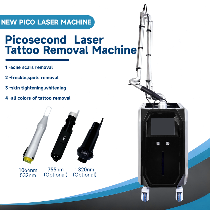 1. Three-wavelength Q Switch picosecond technology: 1064nm for dark tattoos such as black/blue and deep pigments, 532nm for light-colored tattoos such as red/orange, 755nm for difficult-to-remove colors such as green/purple, with pulse width ≤500ps and Q Switch trigger speed <10ns, shattering pigments into nano-scale fragments and reducing the risk of scarring; 2. Intelligent pigment recognition system: Built-in high-definition image acquisition module, automatically analyzes tattoo pigment composition and distribution, matches optimal wavelength and energy parameters, and improves treatment efficiency by 40%; 3. Precise energy regulation: 15-inch touch screen supports stepless adjustment of energy density (1-20J/cm²) and frequency (1-20Hz), stores 50 sets of personalized treatment programs, and supports multi-physician authority management; 4. Four-fold cooling protection: Integrating air cooling + water cooling + semiconductor + sapphire contact refrigeration, the treatment head temperature is stably maintained at 3-8℃, and the epidermal thermal damage rate is reduced to below 0.1%; 5. Professional durable configuration: The laser source has a service life of 300,000 shots, the treatment head adopts scratch-resistant quartz window, and the device has a real-time monitoring function of pigment removal rate, suitable for high-frequency diagnosis and treatment scenarios.