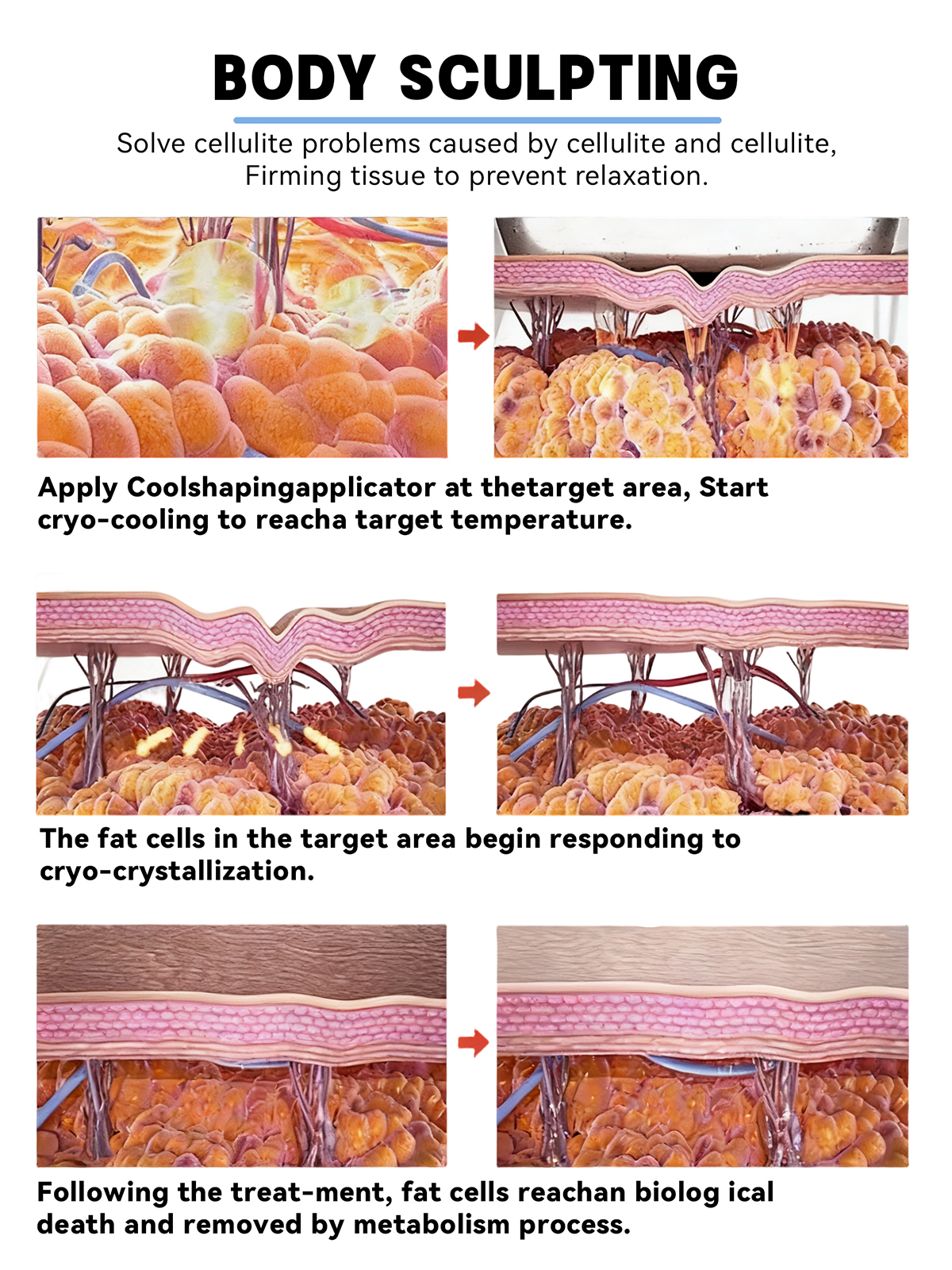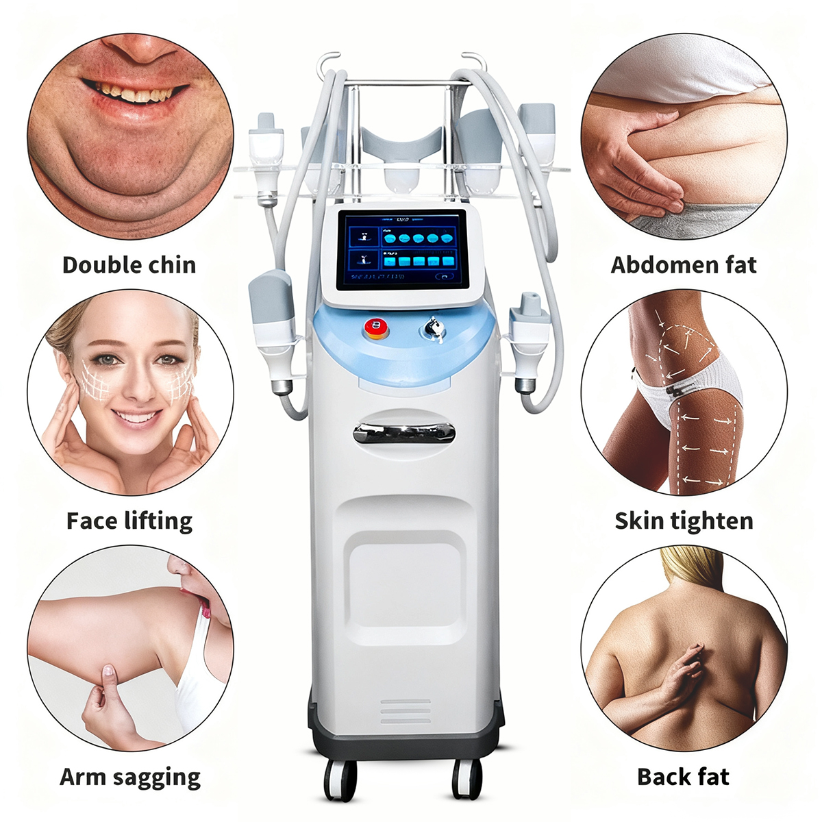 This is a 360° Vertical Silicone Cryolipolysis Machine. Its principle is to cool the fat tissue in a 360° circumferential manner at a low temperature of -16~45℃, which induces the apoptosis of fat cells. Subsequently, these apoptotic fat cells are naturally metabolized and excreted by the human body. It is equipped with a variety of replaceable probes, which can target the fat reduction of excessive fat in the whole body, and it is safe without a recovery period.