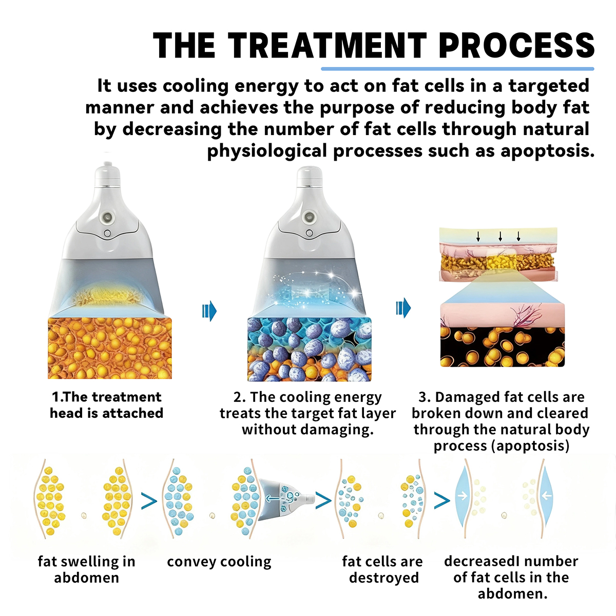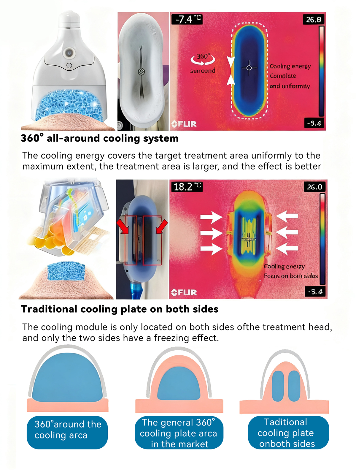 The device adopts a 360° surrounding cooling design, which can fully wrap the treatment area, ensuring that fat cells are uniformly cooled, avoiding local temperature differences, and achieving more uniform and thorough fat metabolism effects.